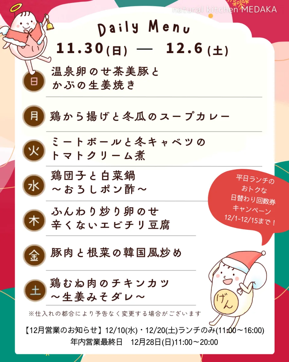 本日の営業時間とメニュー Screenshot 全てのメニューを見る 期間限定メニュー えびとベーコンのトマトチーズリゾットトマトや玉ねぎ、マッシュルームをとろとろ煮込み、ベーコン・えび・モッツァレラチーズ入りのリゾットです 期間限定メニューを見る ご予約商品 2025年米粉のクリスマスケーキ おいしくてカラダに優しい手作りバースデーケーキ 開催中の店内ギャラリー めだかスタッフおすすめ商品展[日程]2025/11/26(水) ~ 2025/12/5(金) めだかのスタッフがおすすめする商品を展示販売します。 スタッフが日頃愛用している商品たちです... めだかのスタッフがおすすめする商品を展示販売します。 スタッフが日頃愛用している商品たちです。 ぜひお手にとってご覧ください☺️ 詳しく見る> 当店では多様化する健康への価値観に応えられるよう通常メニューに加え動物性食品や卵・乳製品・小麦粉を使わないお料理やスイーツもご用意しております。 当店では多様化する健康への価値観に応えられるよう動物性食品や卵・乳製品・小麦粉を使わないお料理やスイーツもご用意しております。 特定の食材を避けたいお客様へ 特定の食材を避けたいお客様へ すべてお食事音楽美容学びアート癒し もっと見る 日替わりメニュー、最新情報を発信してます。 日替わりメニューや、お得なクーポン、期間限定メニューなど配信しています。スタッフブログも気まぐれに更新しているので、是非お気軽にフォローしてくださいね。 Instagram 公式LINE BLOG めだかブログ フィトブログ
