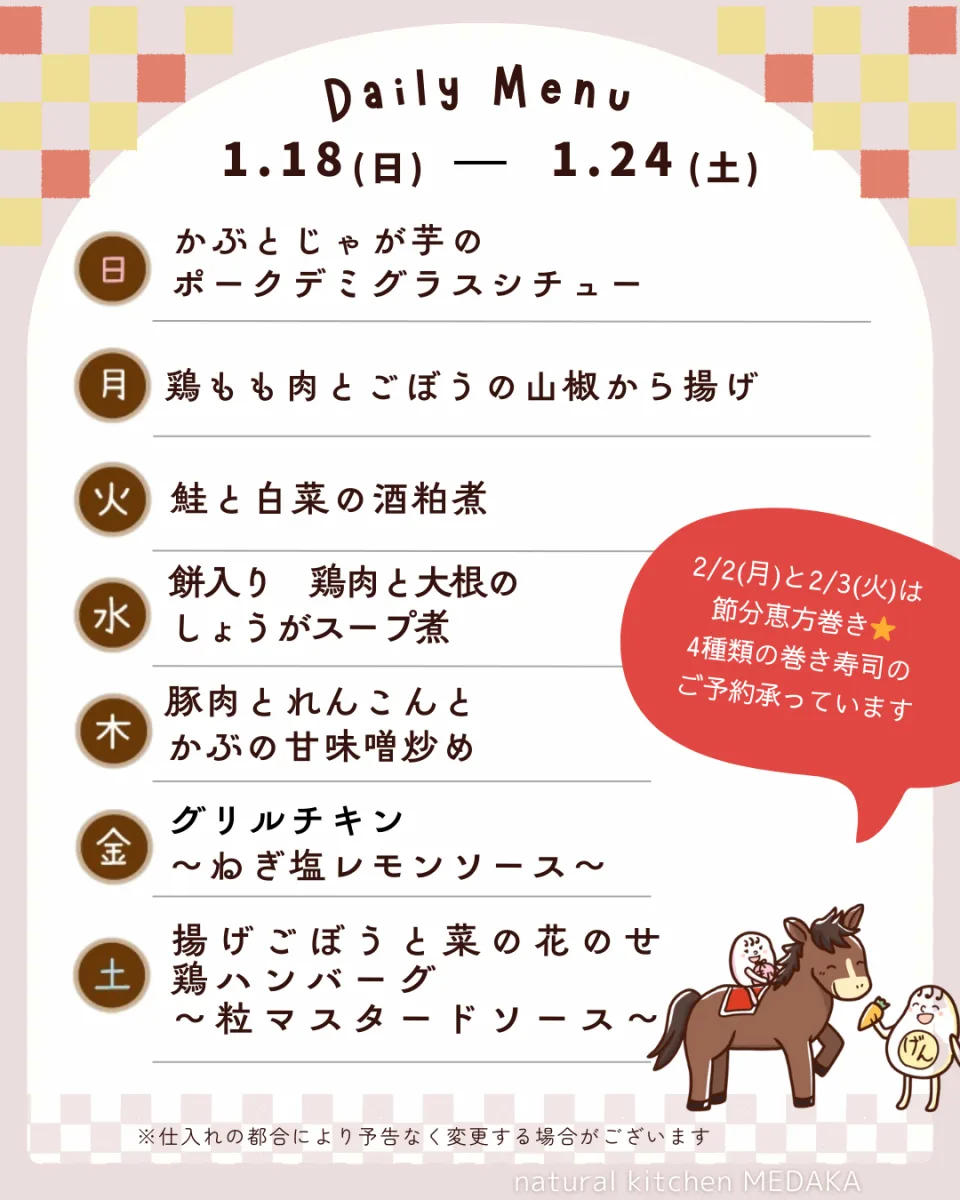 本日の営業時間とメニュー 全てのメニューを見る 期間限定メニュー 茶美豚入り野菜と玄米もちのトマトチゲ鍋あと引くコクとほのかな酸味がやみつきになる人気のスンドゥブ風です。 9種の野菜と健康素材のてづくりキムチ入り、カラダの芯からあたたまります◎ 期間限定メニューを見る ご予約商品 2026年1月26日まで恵方巻きご予約承り中 おいしくてカラダに優しい手作りバースデーケーキ 開催中の店内ギャラリー コパイバ展[日程]2026/1/16(金) ~ 2026/1/31(土) アマゾン天然植物100%ノンケミカル 肌が喜ぶスキンケア商品を展示販売です。インディオ継承... アマゾン天然植物100%ノンケミカル 肌が喜ぶスキンケア商品を展示販売です。インディオ継承の天然ケアグッズで傷治療や肩こり、喉のイガイガにも。研磨剤不使用の歯磨き粉も人気です。 展示中はコパイバ関連全商品5%OFFです。 日時:1月16日~ 1月31日料金:無料場所:natural kitchen めだか 2号店 詳しく見る> 当店では多様化する健康への価値観に応えられるよう通常メニューに加え動物性食品や卵・乳製品・小麦粉を使わないお料理やスイーツもご用意しております。 当店では多様化する健康への価値観に応えられるよう動物性食品や卵・乳製品・小麦粉を使わないお料理やスイーツもご用意しております。 特定の食材を避けたいお客様へ 特定の食材を避けたいお客様へ すべてお食事音楽美容学びアート癒し もっと見る 日替わりメニュー、最新情報を発信してます。 日替わりメニューや、お得なクーポン、期間限定メニューなど配信しています。スタッフブログも気まぐれに更新しているので、是非お気軽にフォローしてくださいね。 Instagram 公式LINE BLOG めだかブログ フィトブログ
