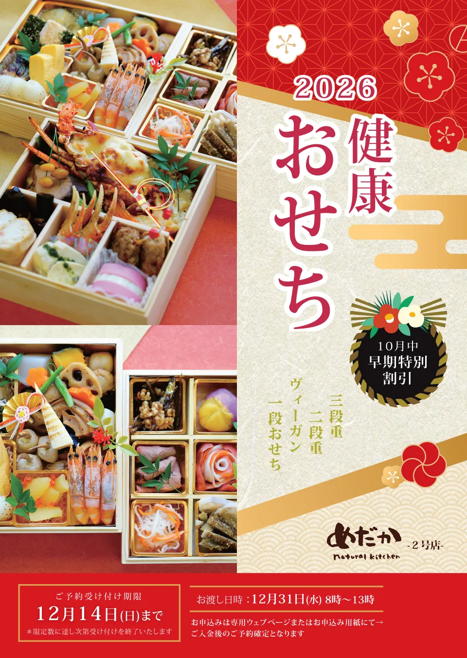 2026年も、みなさまの健康と幸せを願って、こころを込めた「健康おせち」をご用意しました。1段おせちやヴィーガンおせちもございます。新年の大切なひとときに、どうぞお楽しみください。