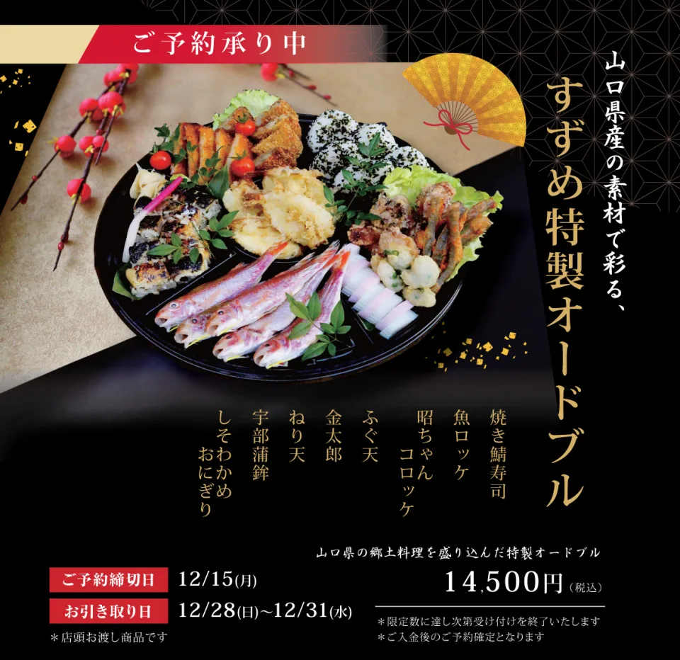山口県の食材を使ったオードブルや、焼き鯖寿司、瓦そばセット