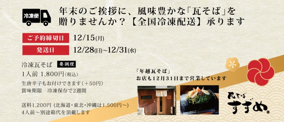 年末のご挨拶に、風味豊かな冷凍「瓦そば」を贈りませんか?12月28日~31日限定、冷凍発送でお届けします。