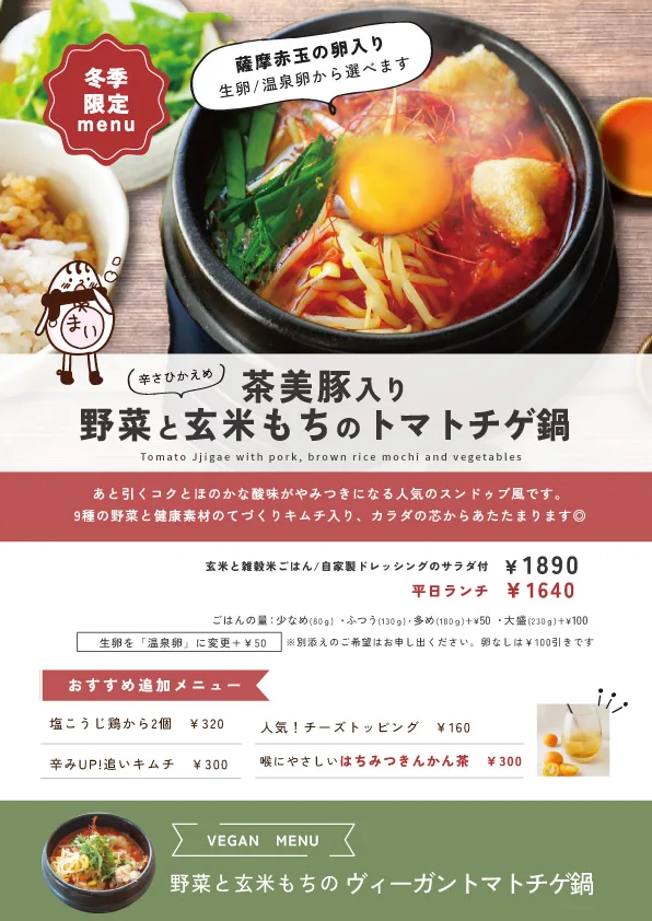 9種の野菜と健康素材キムチ入りでカラダの芯からあたたまっていただける鍋定食です🍲