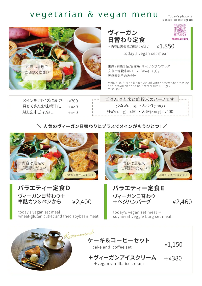 ディナー&ランチ(休日) ヴィーガン店内メニュー